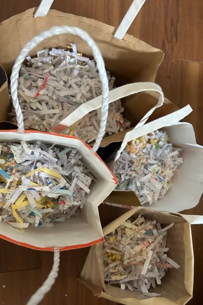 オフィスからでるシュレッダーした紙も活用しています。紙袋にいただきモノや物品購入時に発生した紙袋にまとめて、着火剤の代わりに活用しています。