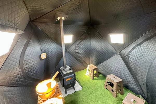 テントサウナは大小2サイズのラインナップがあり、基本的には大きいサイズを利用して広々とした空間をご提供しておりますが、2人だけで小さくやってみたいというニーズにも対応できます。