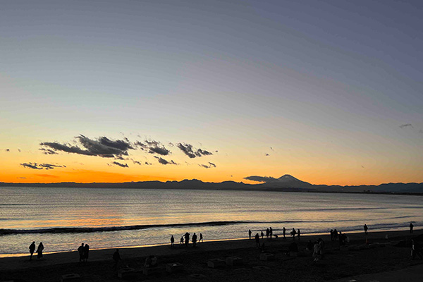 冬の鵠沼海岸からは富士山が見えることが多いです。特に朝夕の時間帯はより鮮明に富士山を楽しむことができます。